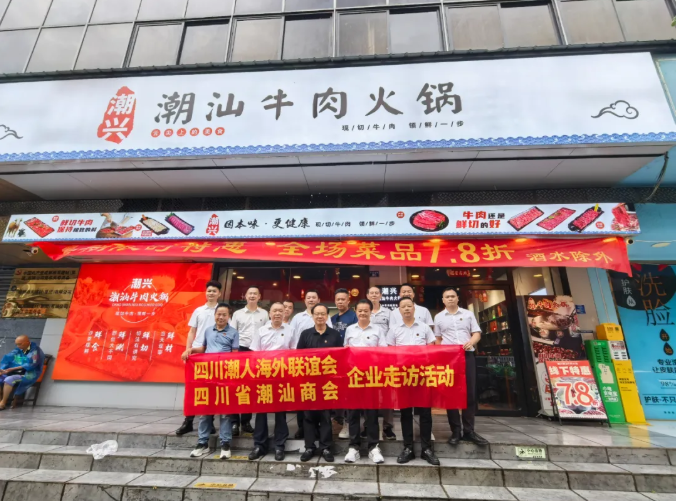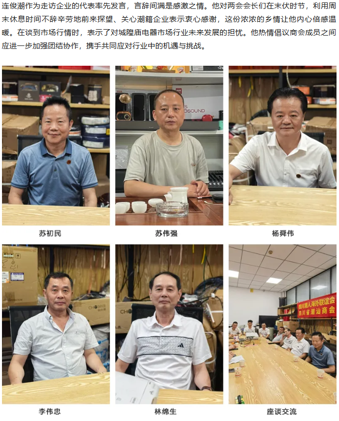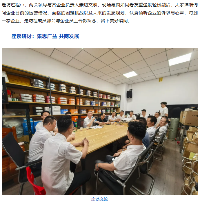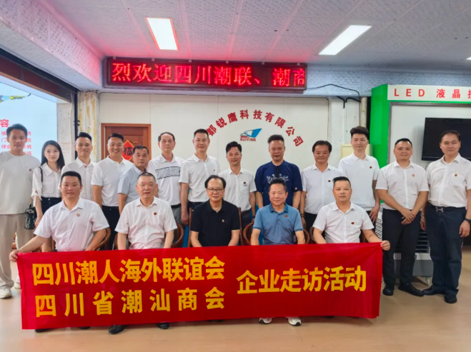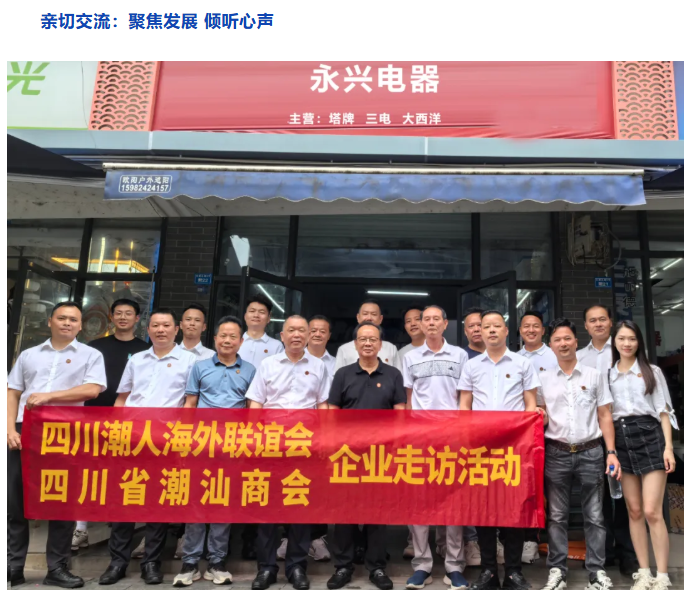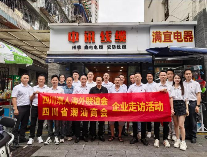 为深入了解成都城隍庙电器市场中潮汕企业的发展状况,2025年8月10日,四川潮人海外联谊会会长陈湖南,四川潮人海外联谊会、四川省潮汕商会(以下简称“两会” )执行会长周昭鹏,轮值会长李剑龙,常务副会长林杰仕、郭丹耿、谢浩志,副会长侯志勇、杨恩林,理事陈焕雄、林楚杰,成都凌华贸易有限公司总经理杨信忠以及驻会副秘书长陈洪、办公室副主任李梦迪等一行人,对常务副会长、秘书长单位四川兴财潮盛科技有限公司,以及理事单位成都锐鹰科技有限公司、四川三然科技有限公司、潮兴潮汕牛肉火锅,还有会员单位成都市金牛区恒利达线缆厂、成都市鑫广网线缆有限公司等多家企业展开走访。