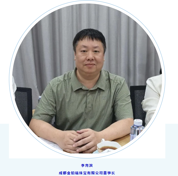 成都金铂瑞珠宝有限公司董事长李总在座谈会上发言,详细介绍了公司的发展历程、经营理念、业务板块及未来发展规划,分享了企业在珠宝行业深耕多年的经营经验与心得,让走访团对企业发展有了更全面、深入的认识。