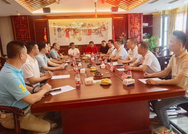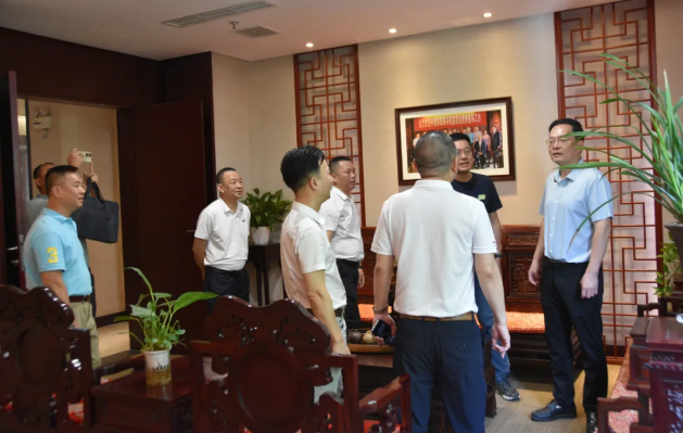 潮安区委常委、副区长林延雄,潮州市第六招商先锋队领队、市政数局副局长辜美加等一行在周昭鹏等人的陪同下,首先参观了两会发展历程形象墙。形象墙上,一幅幅珍贵的照片、一段段详实的文字,生动展现了“两会”自成立以来的发展轨迹和重要里程碑,让考察组成员对“两会”的历史有了直观而深刻的了解。在组织架构墙前,工作人员向考察组成员介绍了两会理事会成员的组成情况,考察团成员对“两会”规范的组织架构表示赞赏。随后,考察组还参观了会长室及党建活动室。会长室布端庄大方,彰显着商会的文化底蕴与领导风范;党建活动室则充满了浓厚的红色氛围,展示了两会积极向上的党建工作成果,墙上悬挂的党旗、党徽以及党员活动照片,让考察团成员感受到了“两会”对党建工作的重视。